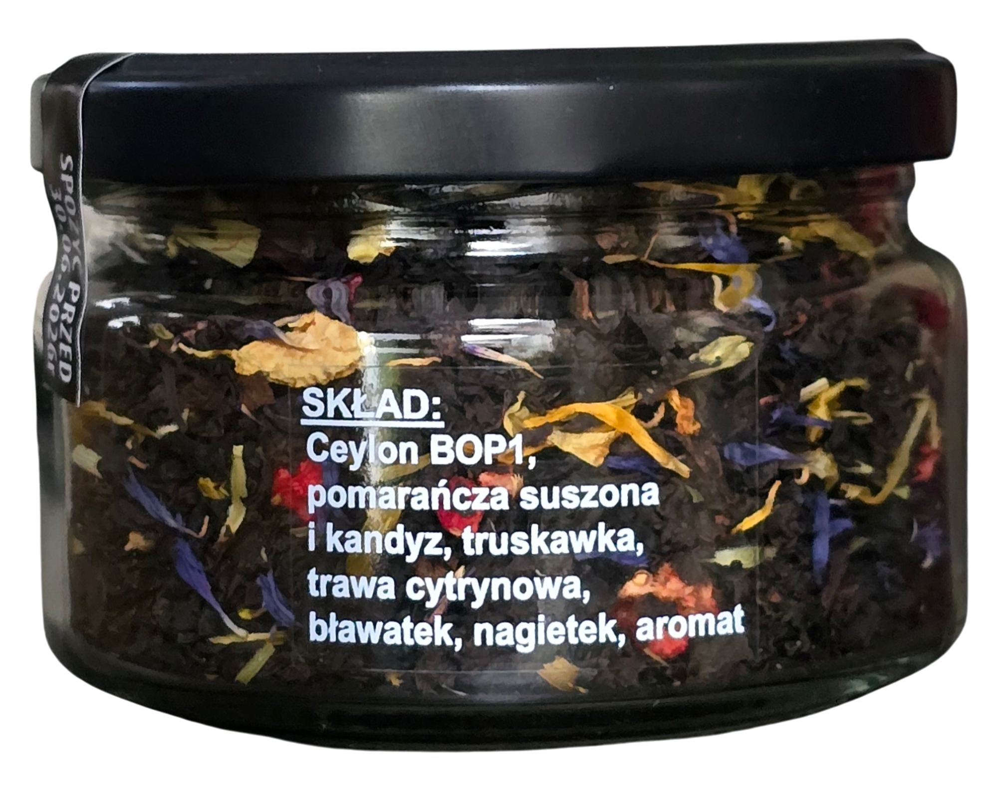 Skórka pomarańczy (suszonej i kandyzowanej) – Słoneczny akcent, który wnosi lekkość, owocową nutę i delikatną słodycz do naparu. Suszona skórka to naturalne źródło cytrusowej świeżości, a kandyzowana dodaje delikatnej karmelowej głębi.
