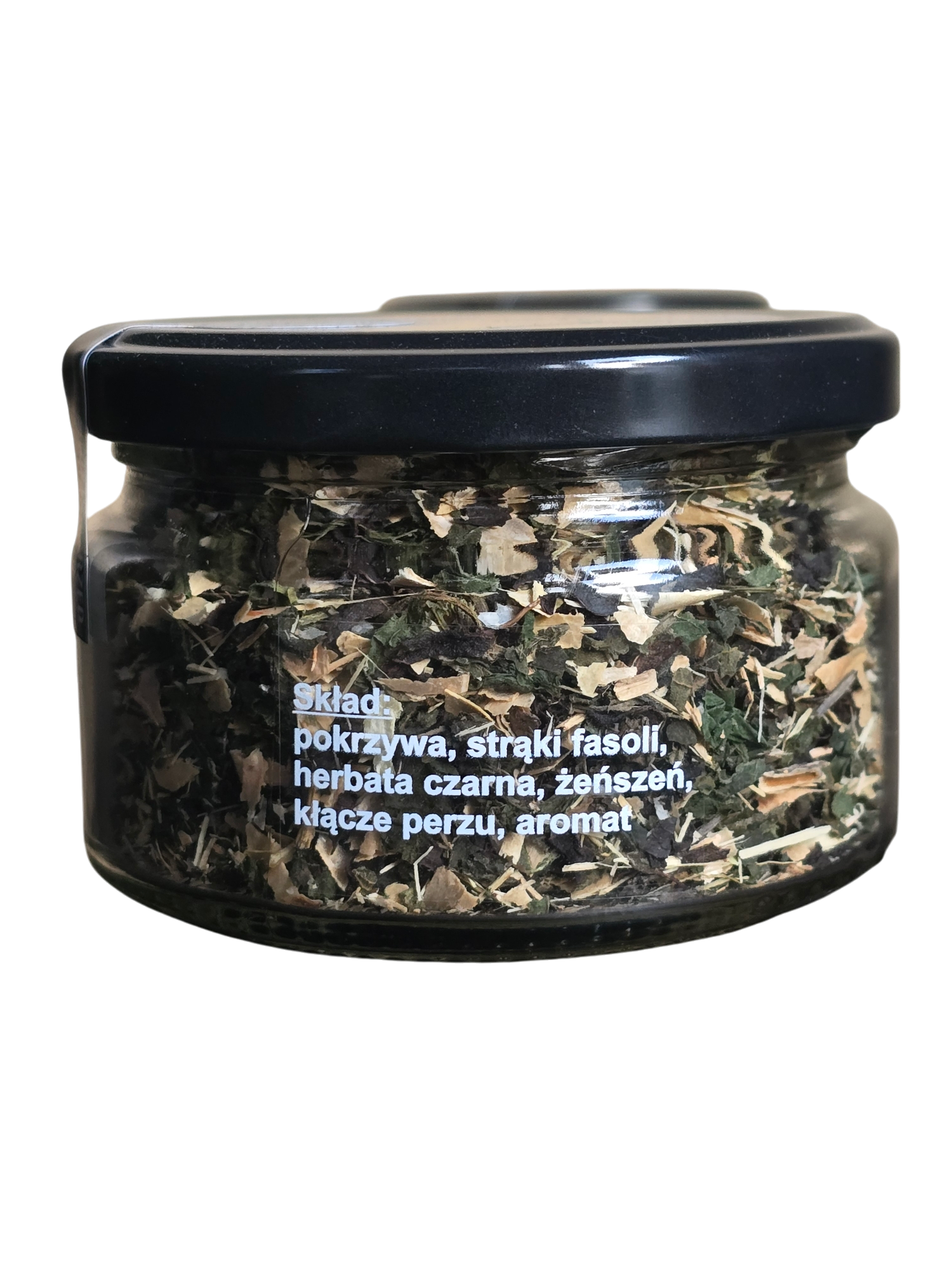 Baza: Pokrzywa, strąki fasoli, herbata czarna, żeńszeń, kłącze perzu – naturalne składniki, które wspomagają zdrowie.