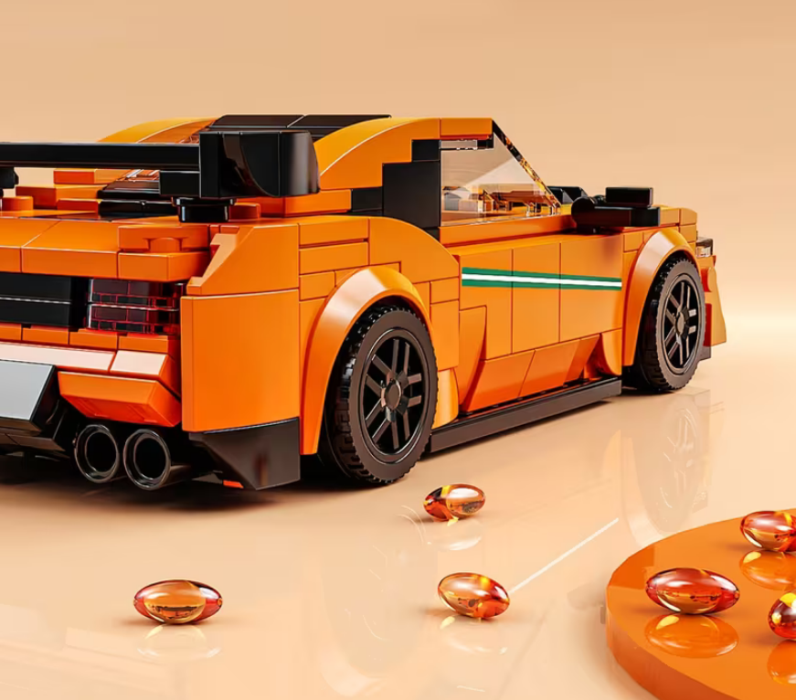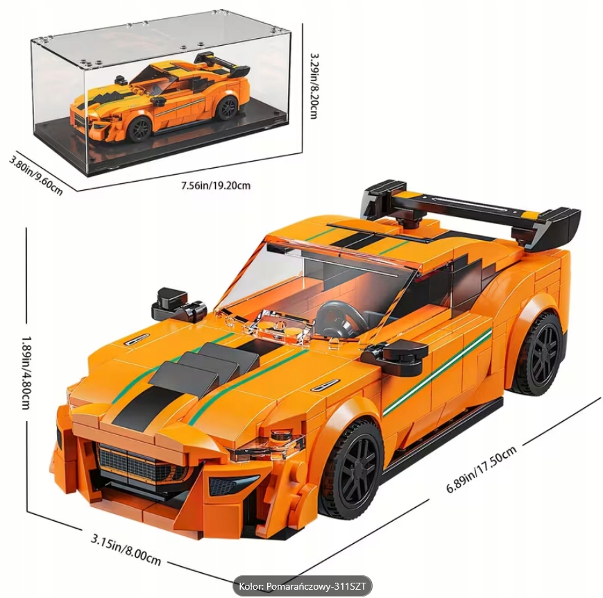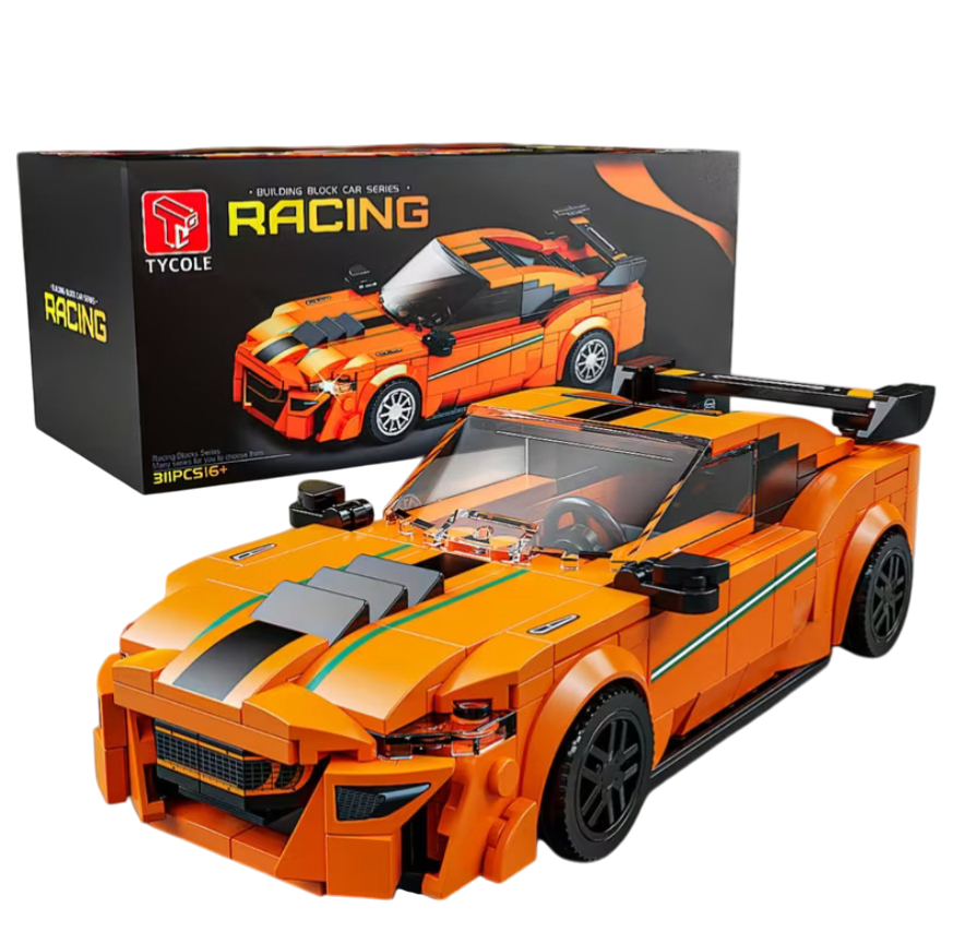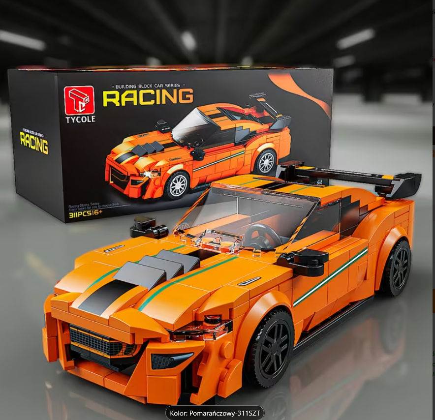 Zabawkowy zestaw klocków konstrukcyjnych do samodzielnego zbudowania realistycznego pomarańczowego samochodu wyścigowego. Z 311 elementami w jaskrawych barwach (dominujący pomarańczowy z akcentami), dziecko stworzy bolid z dużym silnikiem, spojlerem, błyszczącymi felgami i detalami tuningowymi. Idealny dla małych fanów motoryzacji i Formuły 1!