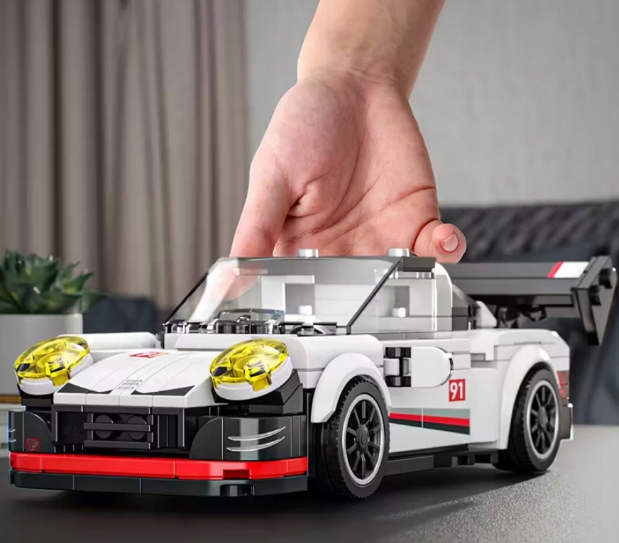 Zabawkowy zestaw klocków konstrukcyjnych do samodzielnego zbudowania realistycznego białego Porsche. Z 323 elementami w jaskrawych barwach (dominujący biały z akcentami), dziecko stworzy ikoniczny bolid z dużym silnikiem, spojlerem, błyszczącymi felgami i detalami tuningowymi. Idealny dla małych fanów motoryzacji i Porsche!