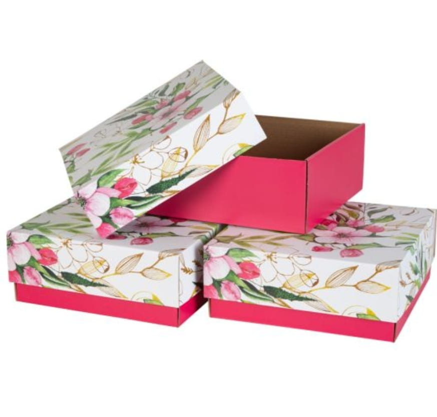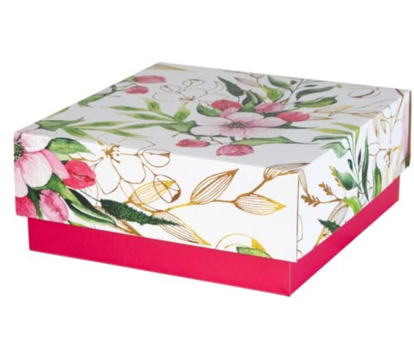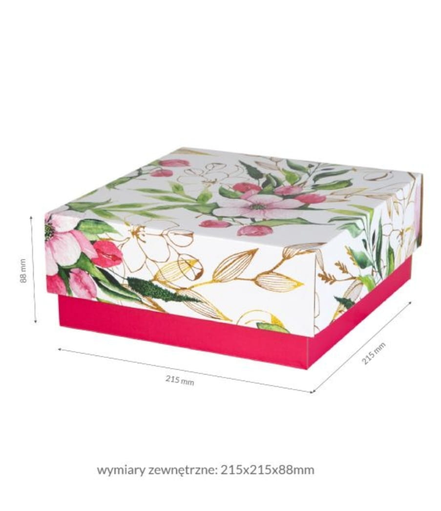 - Kolorowe pudełko wieko-dno z nadrukiem kwiatów – doskonałe do prezentów.